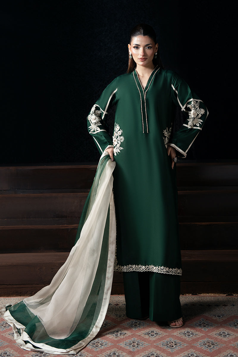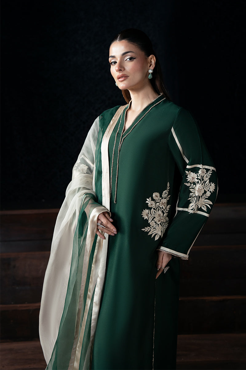 A rich emerald green ensemble accented with delicate ivory floral embroidery along the sleeves and hem, creating a striking yet graceful contrast. The relaxed straight silhouette paired with wide trousers offers effortless elegance, while the soft contrasting dupatta adds fluid movement and charm.