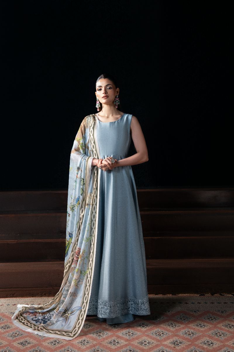 A soft blue pishwas paired with a delicately printed dupatta, finished with subtle embroidery at the hem. Effortless, airy, and graceful perfect for Eid mornings, daytime festivities, and intimate gatherings
