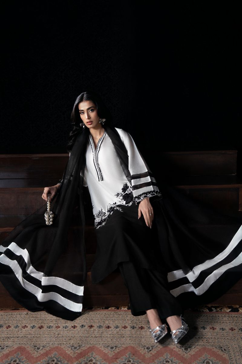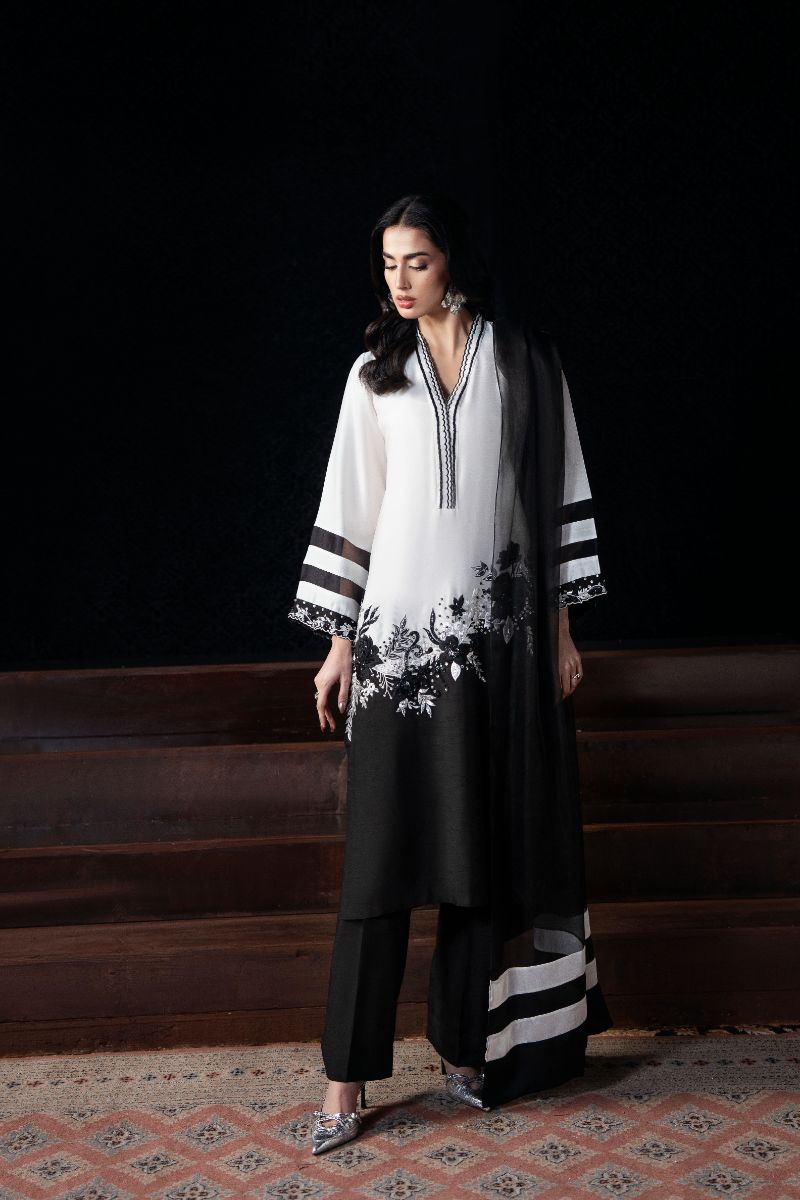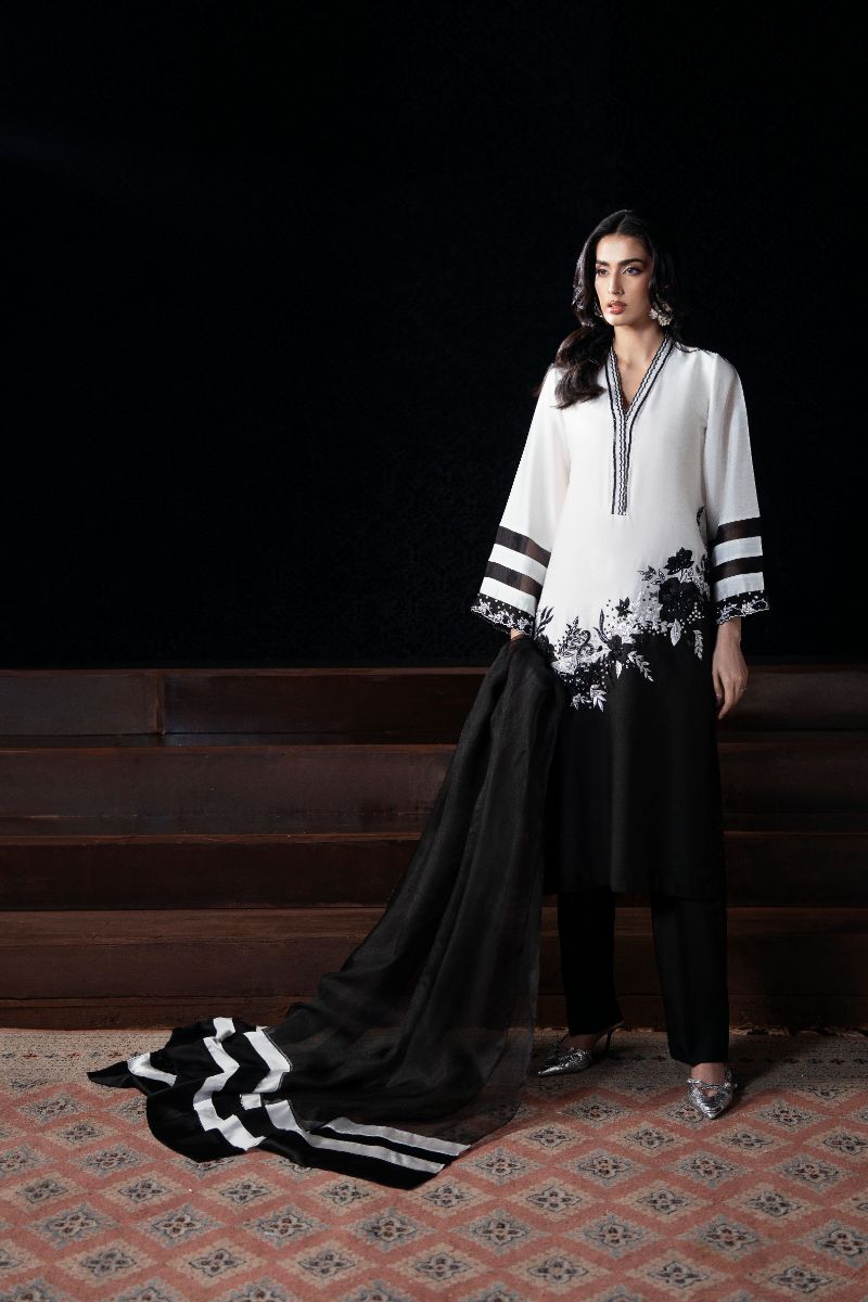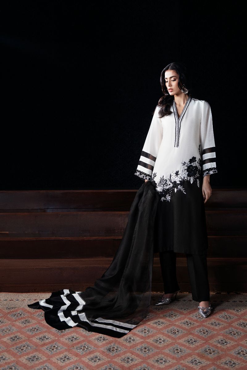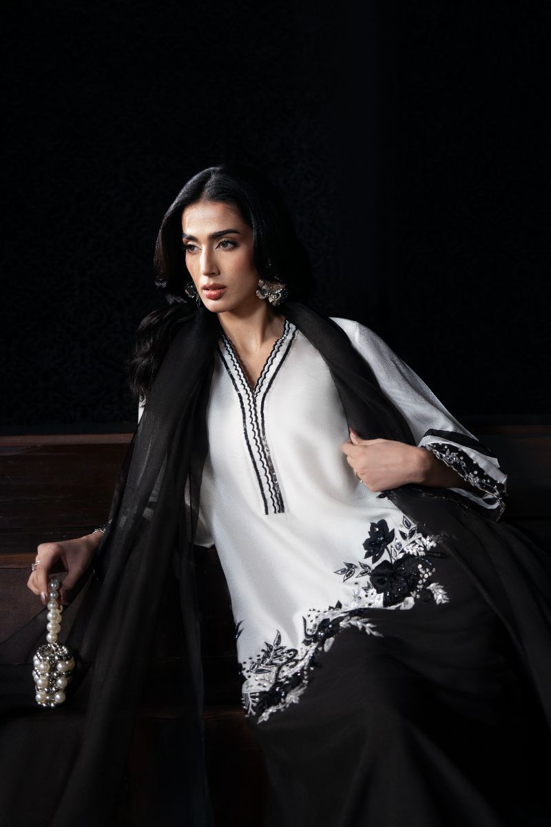 A striking black-and-white ensemble that blends sharp contrast with delicate floral detailing. The clean V-neckline, statement sleeves, and softly embroidered hem create a timeless silhouette that feels modern yet elegant perfect for chic evenings, formal lunches, and understated festive wear